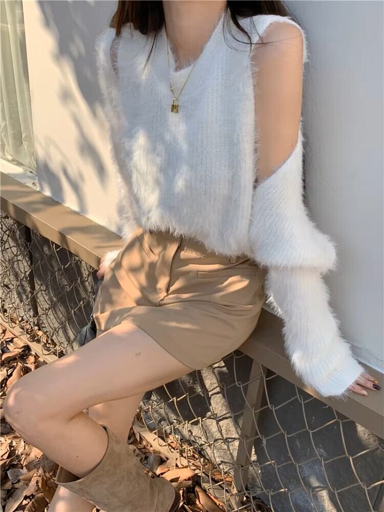 この2色展開のシャギーニットセットは、ふわふわで、もこもこの心地よい素材が特徴です。シャギーニットの柔らかな質感が、見た目にも暖かさを与え、寒い季節のおしゃれを楽しむための必須アイテムです。カーディガンとトップスのセットは、別々でも組み合わせてもお楽しみいただけるので、スタイリングの幅が広がります。